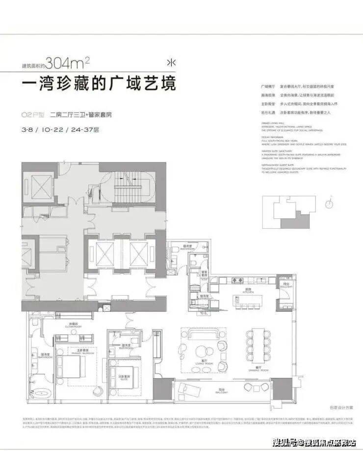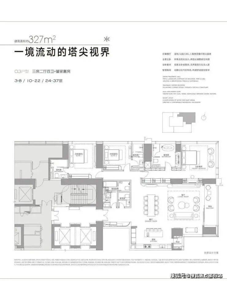 首推3栋低区户型(3-37F),高区570-1032㎡还没出样板间:实地样板间304/327/402㎡三个户型,全是"大空间+家政套间",卧室基本都是套间,所有户型都很有舒适度,整个楼栋外立面是玻璃幕墙,这样的设计采光和景观都很好。