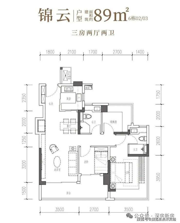 •锦云·建面约89㎡3房2厅2卫:南向阔厅,景致常驻,间间开阔,尺度舒适