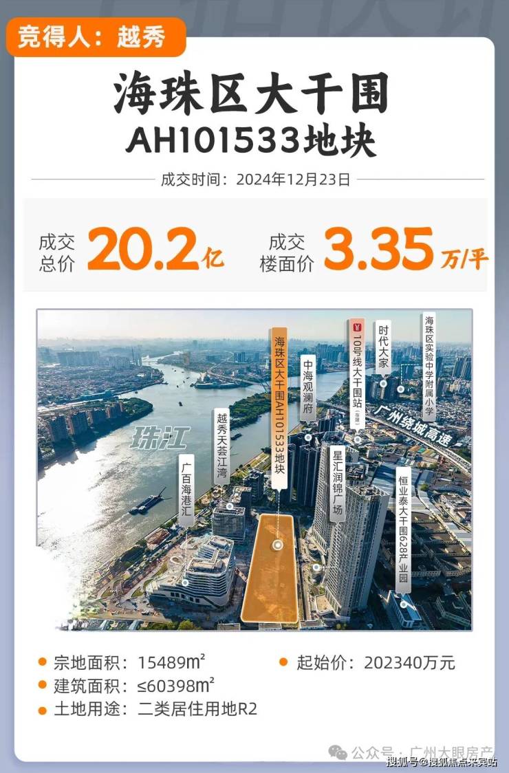 2024年12月23号,海珠大干围地块被越秀以20.23亿元拿下,楼面价为33501元/㎡。