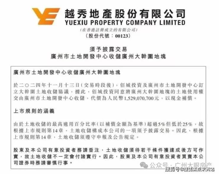 2024年11月13日,地块由广州土发中心中心收储,越秀地产因此将获得15.29亿元的现金补偿;