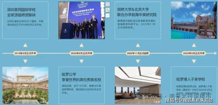 世界著名学校英国哈罗公学(已开学)、哈罗港人子弟学校(在建中)、美国荟同国际学校(已开学),以及剑桥大学&北京大学联合办学前海中英研究院(已开学)