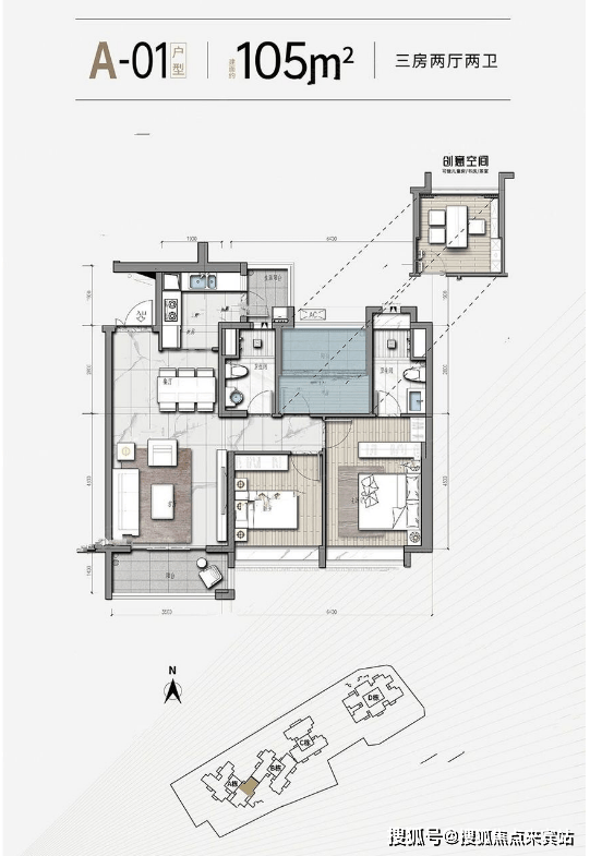 105㎡三房两厅两卫是主力户型,分布在多个楼栋的不同楼层