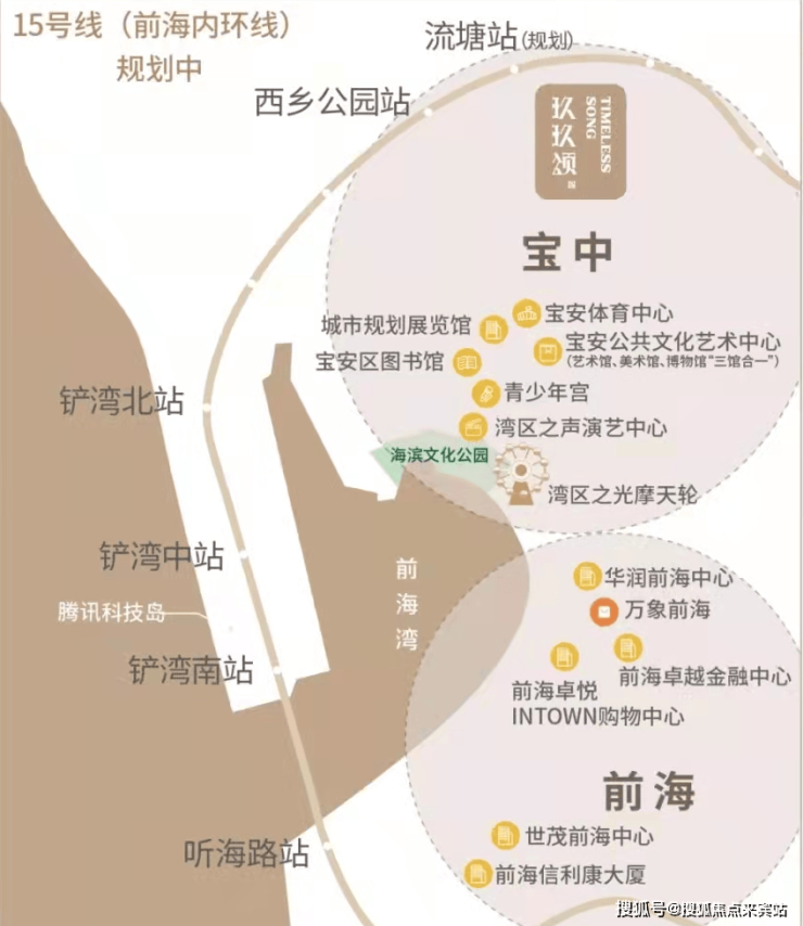 宝安体育中心、宝安公共文化艺术中心、青少年宫、宝安区图书馆、湾区之光摩天轮、湾区之声演艺中心、城市规划展览展等。