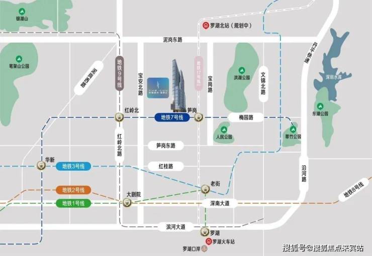 项目下方是地铁7号线笋岗站D出口上盖,规划中17号线笋岗站未来将实现换乘,往南两站可达华强北,往北三站直通红岭北CBD,形成真正意义上的双轨交汇+主城中点。