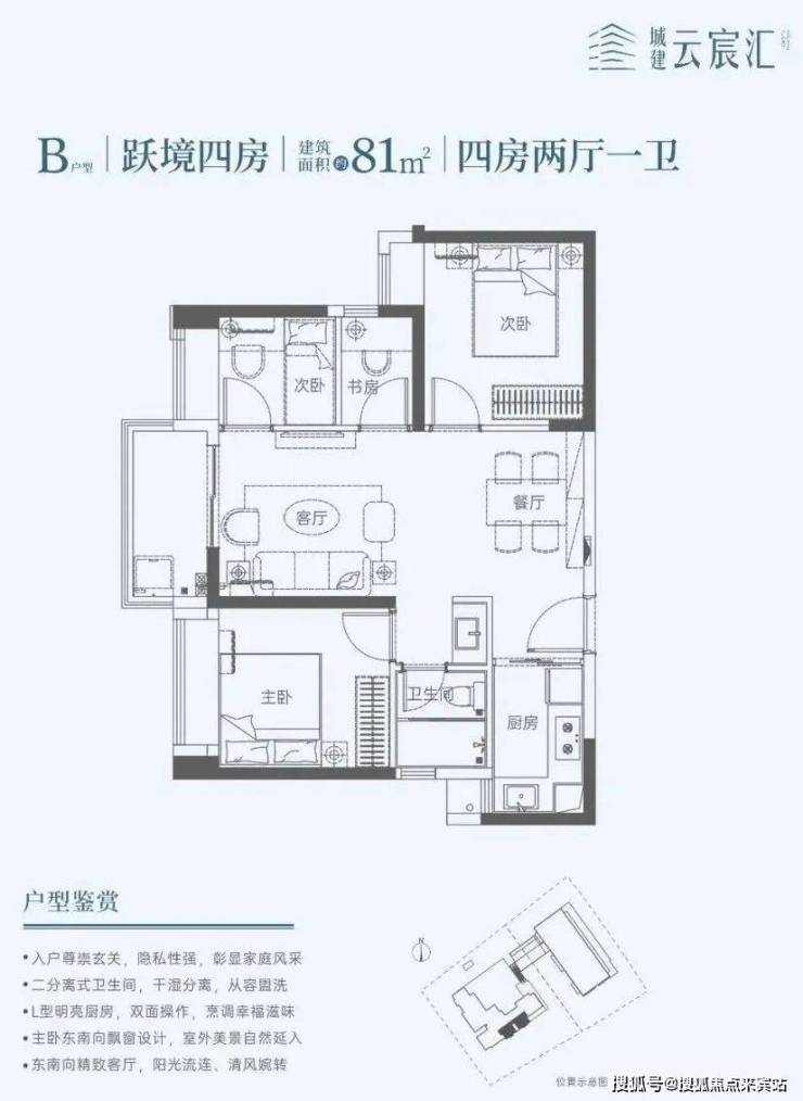 81㎡的4房2厅1卫,设计的双龙抱珠格局,餐客厅一体化,L型厨房,东南朝向,这个面积段能做到4房现在的市面上非常难得。