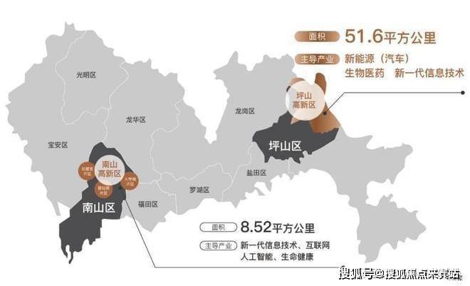 “西有南山,东有坪山”,政府约6000亿重金投入,约1.5个前海的投资总额,形成了“坪山国家高新区+坪山大学城+燕子湖会客厅”产学研一体化的规模,新能源(汽车)、生物医药、新一代信息技术和智能制造为主导的产业云集,造就东部中芯新时代。