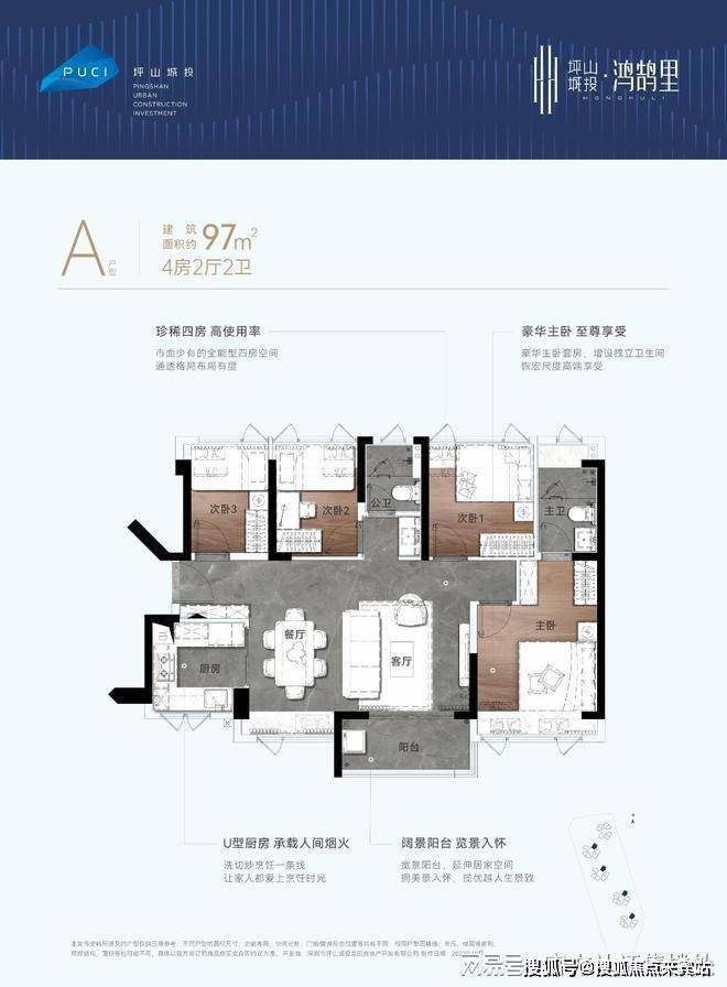 73平做3房1.5卫,97平做4房,加上得房率也是坪山数一数二的,不加赠送就去到了80.3%的得房率。