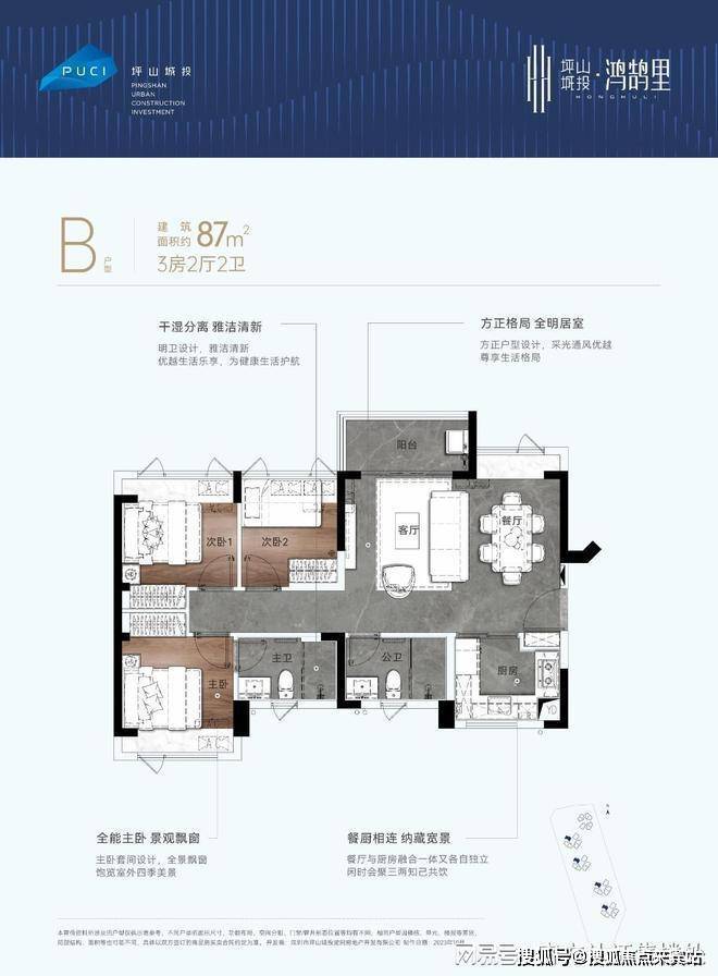 87㎡的3房2厅2卫:设计的是横厅南北通透格局,餐客厅一体化,U型厨房,得房率80.3%(不加飘窗),全屋飘窗设计,阳台主朝东北向。