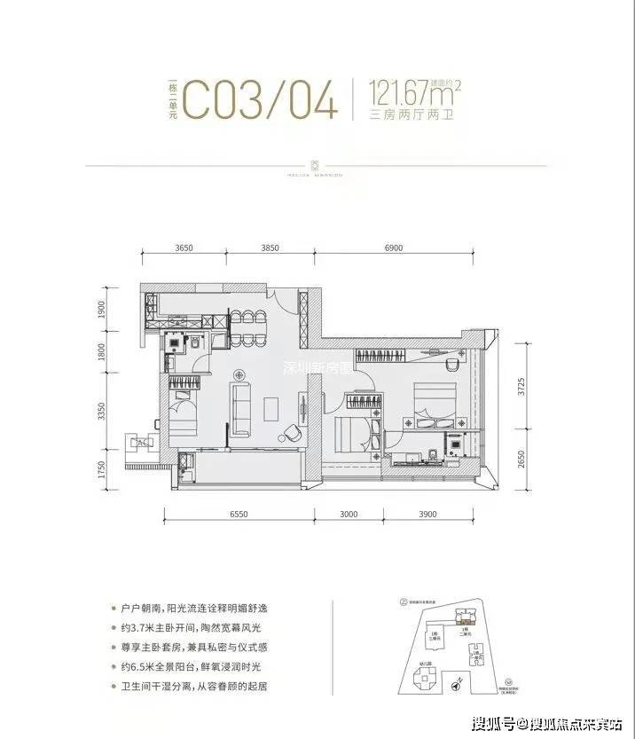 采用全套房设计,一体化客厅,超大面宽阳台,多角度采光,270°全面落地玻璃,IMAX巨幕视野,高尔夫景观+深圳湾海景+城市CBD的360°一览无遗,打造出“一层一世界”的空间视野,推门而入的第一刻,视界已在俯仰之间,以稀贵视野纳藏每一帧风景。