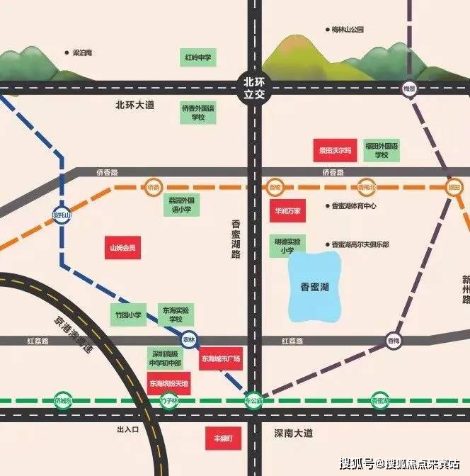 规划香梅路延长线/福华一路延长线穿过深圳高尔夫公园,将形成香蜜湖北、中、南区高效内循环,未来项目约一公里直达香蜜湖金融中心中区,与国际交流中心、深圳改革开放展览馆、国际演艺中心、深圳金融文化中心四大地标配套为邻。