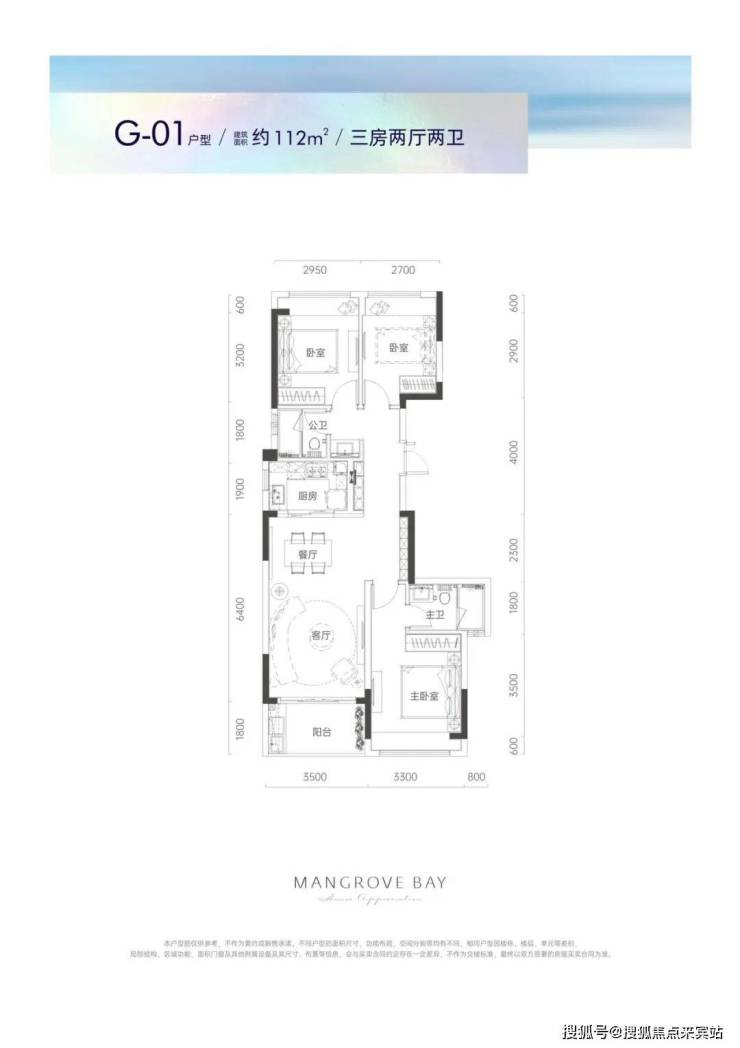 G01户型112平3房2厅2卫:同样拥有客厅、餐厅连通阳台的设计,自然采光充足;全屋飘窗,尽享超大采光面;主卧独立卫生间;动静干湿分离。