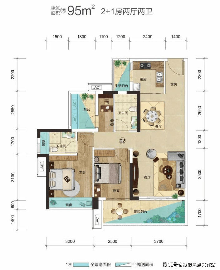 建面约95㎡3房户型的亮点: 户户朝南,动静分区,约6.2米大阳台,270°景观房;科学3房布局,户户朝南,6.2米瞰景大阳台;主卧舒适套间+270°景观房,超舒适享受。
