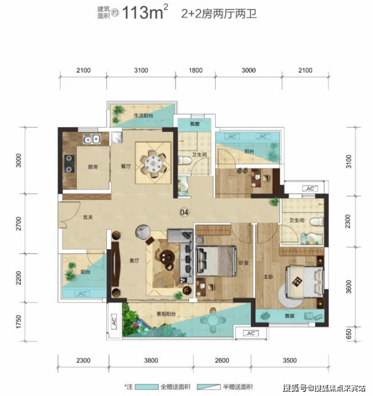 建面约118㎡4房户型的亮点:约6.9米大阳台、主卧套间、270°景观房; 奢阔4房设计,南北对流双阳台设计,朝南6.9米大景观阳台瞰景;主卧舒适套间+270°景