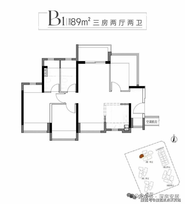 89m²的3房2厅2卫,B1户型,设计的是竖厅南北通透格局,进门入户玄关,客餐厅分离设计,五开间朝南,主卧南北双飘窗,次卧270°无柱飘窗,U型厨房,卫生间干湿分离,得房率95-101%(包含赠送),阳台主朝西北向。光明新房市场少有的89平竖厅南北通户型