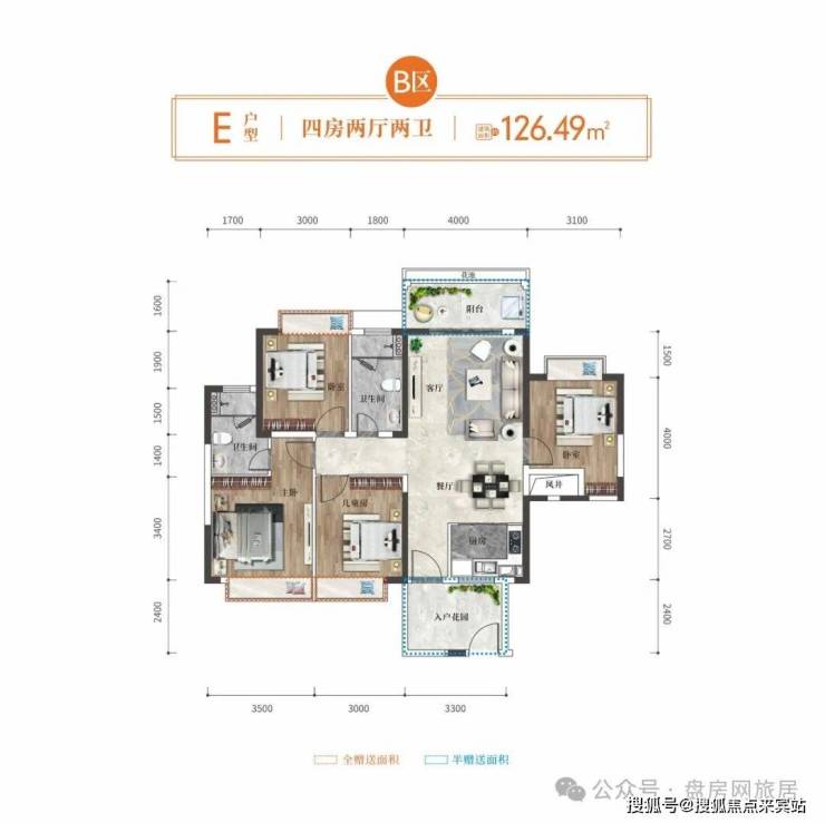 E户型:126平创享3+1房,南北通透阳光鲜氧,双厅一体纵享阔境排场