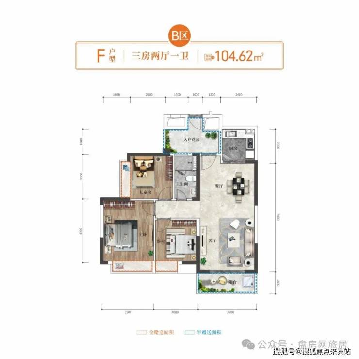 F户型:104平精致3房,全明通透通风赏景俱佳,双厅一体放大欢聚尺度