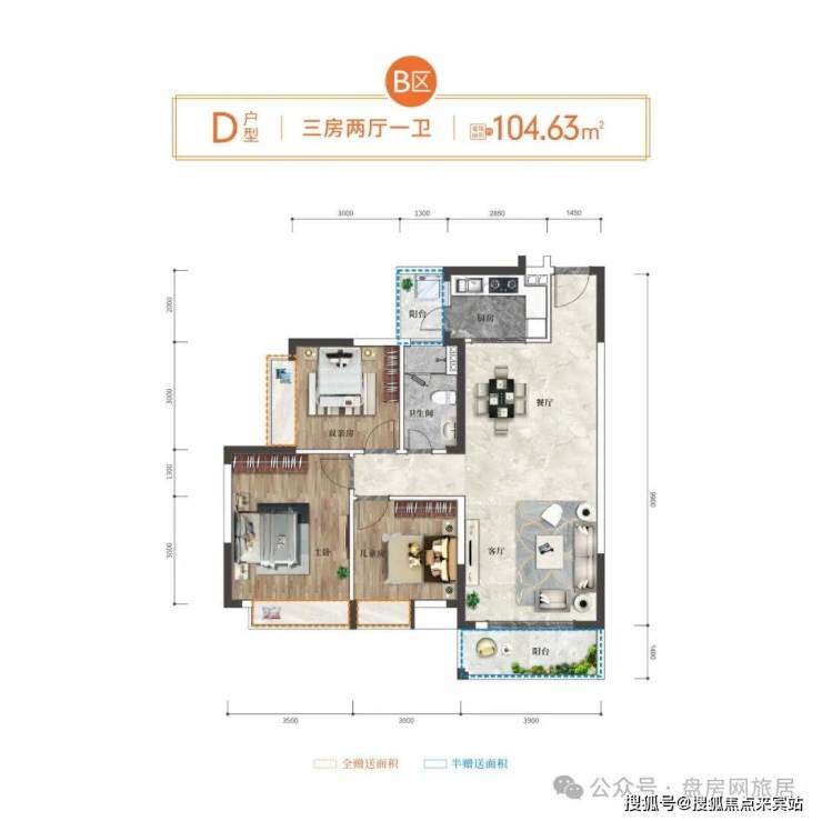 D户型:104平精致3房,奢阔双阳台安放生活与诗意,室室大飘窗百变功能随意造