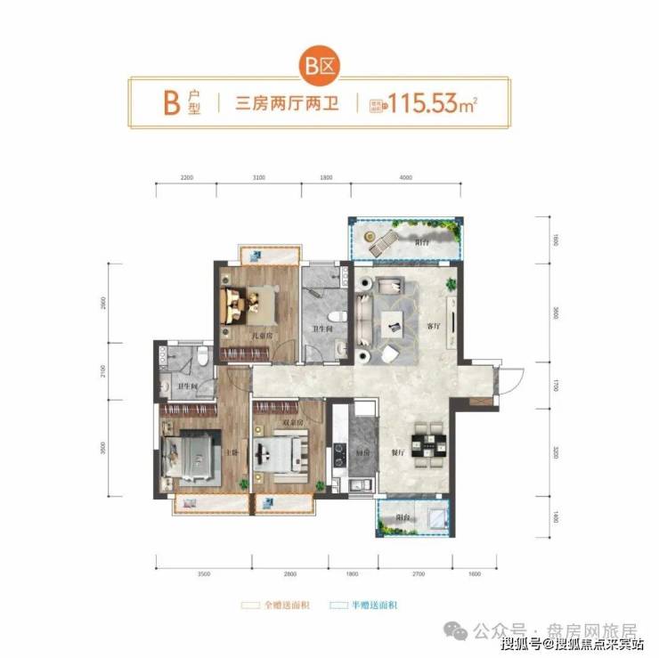 B户型:115平阳光3房,入户大玄关充沛收纳空间,双品质卫浴让生活更从容