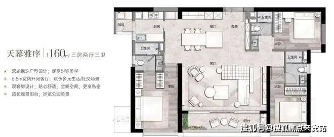 建面约160㎡的3房3卫户型,总价900万起。该户型为西南朝向,可俯瞰铁路公园,采用动静分区设计,双套房配置,客餐厅一体化,大面宽采光,非常适合高端改善家庭或三口之家。