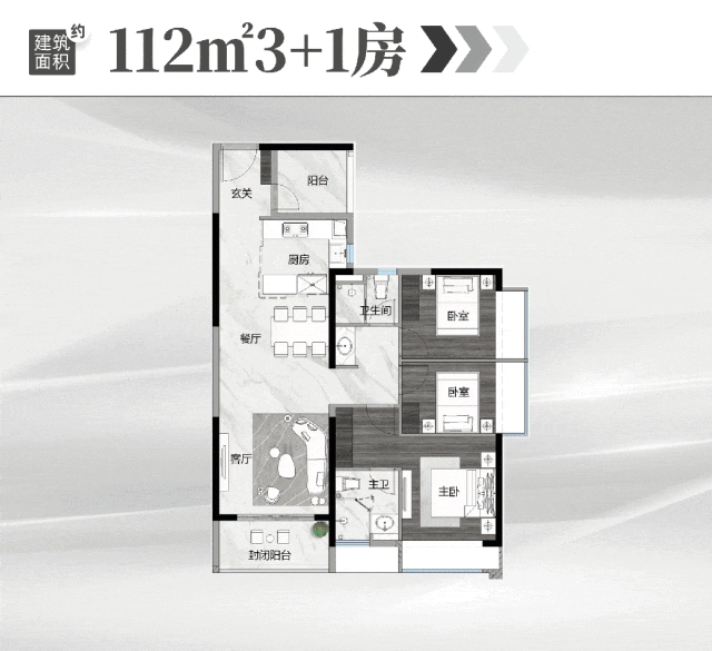 112㎡ 3+1房2厅2卫:LDKB一体化设计,全屋80cm阔景飘窗升级,适合追求舒适生活的小家庭。