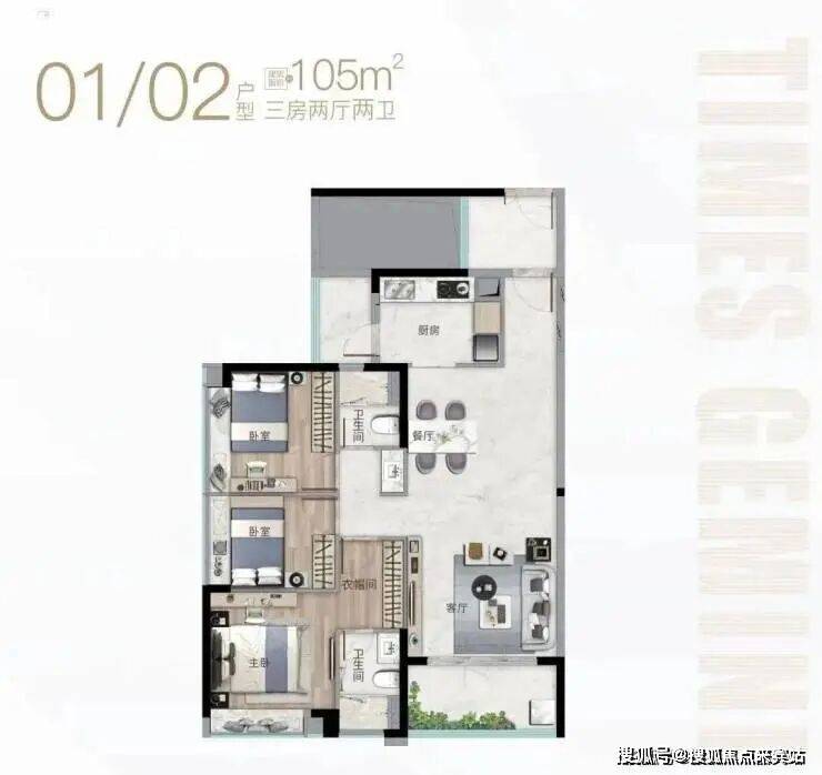 G1栋:蝶形设计,两梯六户,户型面积为99-106平方米三房。