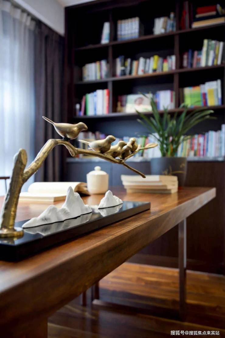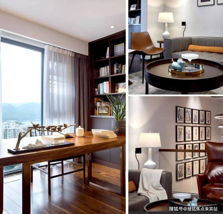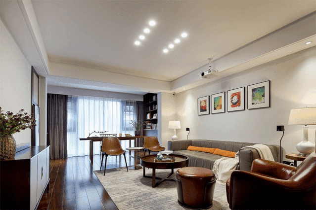 软装上将休闲空间与书房区做了细致的功能分离,既彼此独立又互相依存。休闲空间复古皮质沙发的搭配提升了空间的品质。