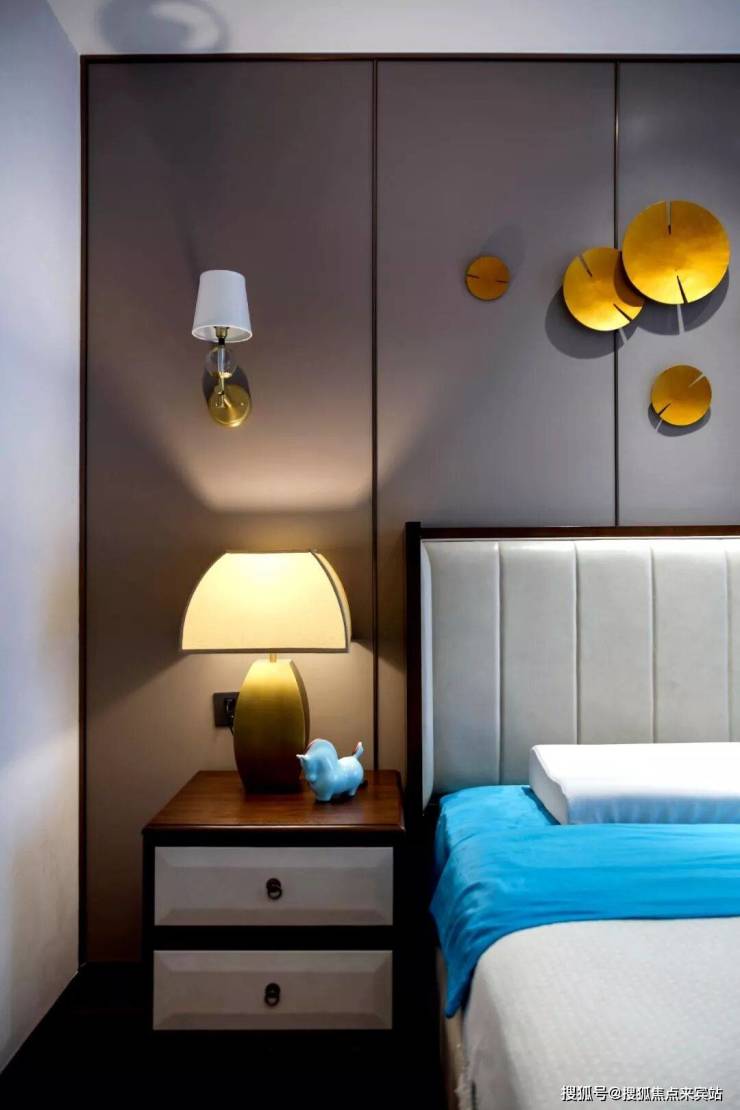 主人床采用的皮革面料被处理得极其柔软,加上丝绸与绒面相间的床褥,搭建生活的品质感。文雅大气的墙面硬包,点缀金色的饰品,不喧哗而独具格调。