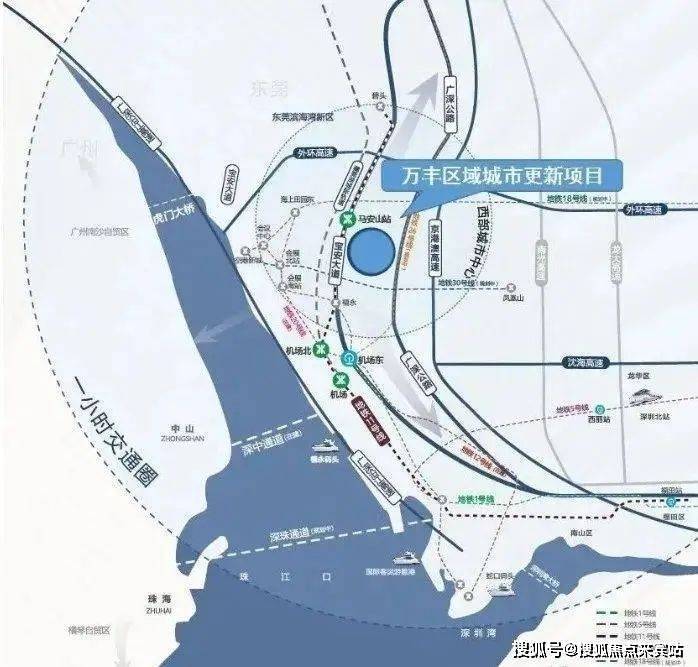 从宝安机场客运码头出发,可以到达香港、澳门、广州、珠海、中山5座城市。陆路交通已经形成“两横三纵”,“两横”是项目南北两侧的南环路、新沙路,“三纵”是项目西侧宝安大道、东侧中心路和107国道。高速方面拥有“四大高速”,广深高速、京港澳高速、广深沿江高速、外环高速等。深中通道预计2024年建成通车。