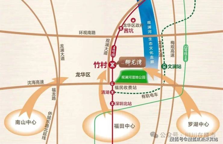 轨道交通:地铁4号线竹村站上盖,商业MALL直连,停车场直连地铁出入口,7站速达深圳北、13站钟直达福田中心,对接深港生活圈;有轨电车文澜站,直线距离约500米,地铁22号线(在建中)。