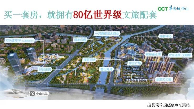 华侨城欢乐海岸坐落于岐江河边,总占地近30万方,投资约80亿元,规划了缤纷曲水湾商业街、时尚综合体、度假酒店、科技乐园、创意文化园、乐活居住区、生态湿地公园等不同功能和业态板块,为中山带来一张全新的城市名片,2024年建成开放。