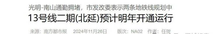 近日,针对网友咨询的13号线光明段(13号线二期北延段)通车时间的问题,官方给了回复: 关于对外轨道交通规划建设,光明区范围内已运营6号线、6号线支线,光明-南山区间规划有13、29号线。其中13号线二期(北延)正在加快建设,计划2025年开通运行,建成后将为南山-光明间提供便捷直达轨道出行方式。