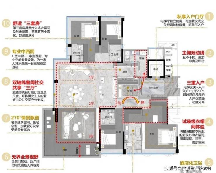 建面140平四房三卫,入门级户型,部分也可望到湖景,双套房设计,南向开间,两个次卧之间没有承重墙,打通后可做成3个套房,另外独梯入户,全屋12%收纳比,配置超大玄关柜