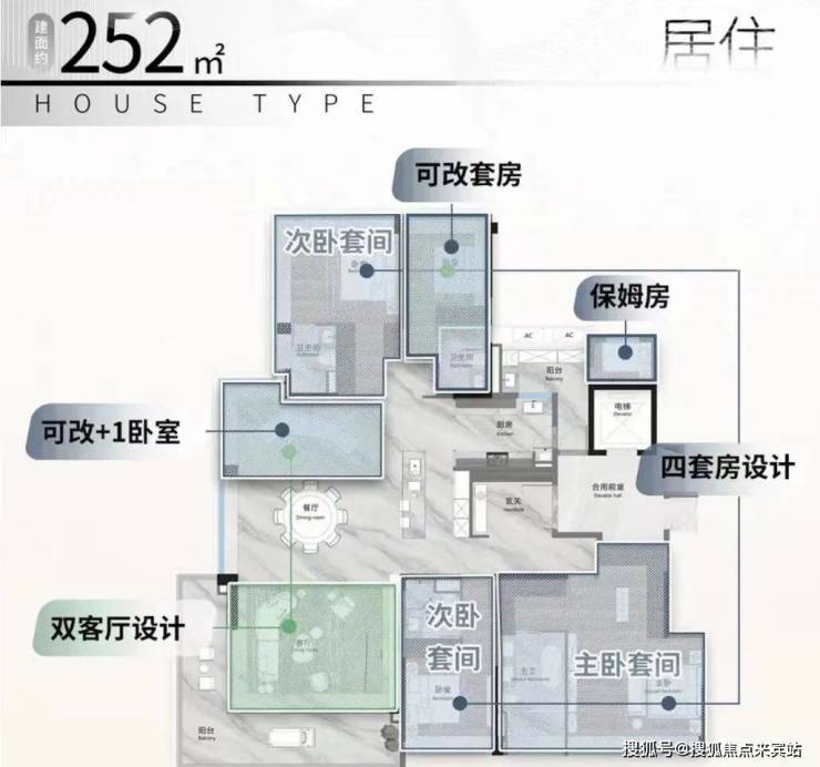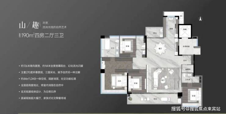 建面190平四房三卫,四开间朝南,超大玄关专梯入户,9.4米观景阳台,客厅与次卧打通的话,客厅开间也可达9.4米,超43平的主卧,270度环幕飘窗