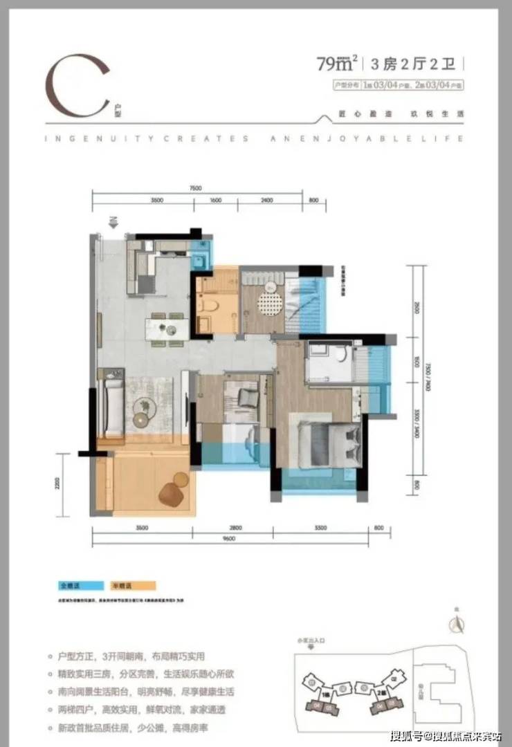 户型多样:79-188㎡两至四房,方正通透,餐客厅一体化,宽阳台 + 飘窗设计。