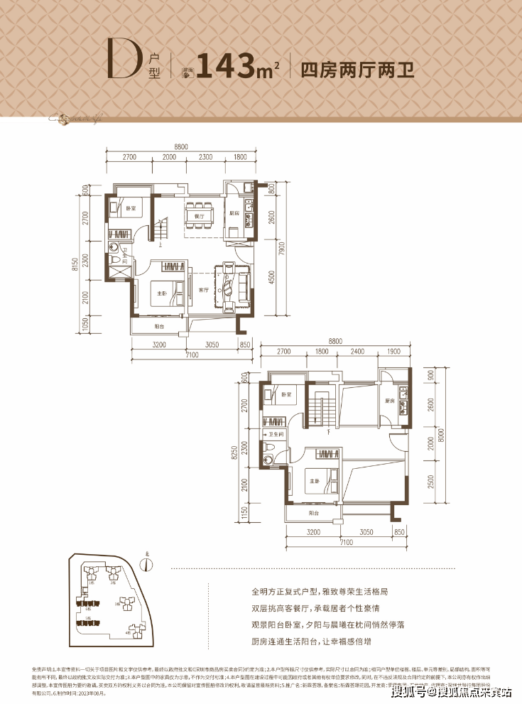 143㎡的复式4房2厅2卫,可以改5-6房没问题,客厅4.5米开间,挑高6.3米,一层两户,总高9-10层的小洋房,南北通透。