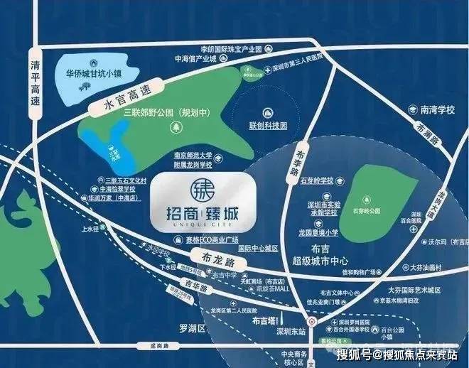 招商臻城项目位于龙岗区吉华街道三联社区,背靠三联郊野公园。从深圳版图全局来看,吉华街道处于深圳中轴线上,东临坂田西临横岗,南临罗湖、福田市区。既可承接罗湖的产业、人口外溢、地铁连接多个中心和枢纽,又有东进战略的支持,具有一定的区位优势。项目地块原为布吉三联片区的松元头片区旧改,在2010年被纳入更新计划。根据规划,项目建面达近100万㎡,住宅、公寓、办公、商业、教育、文体配套于一体,分4期建设。