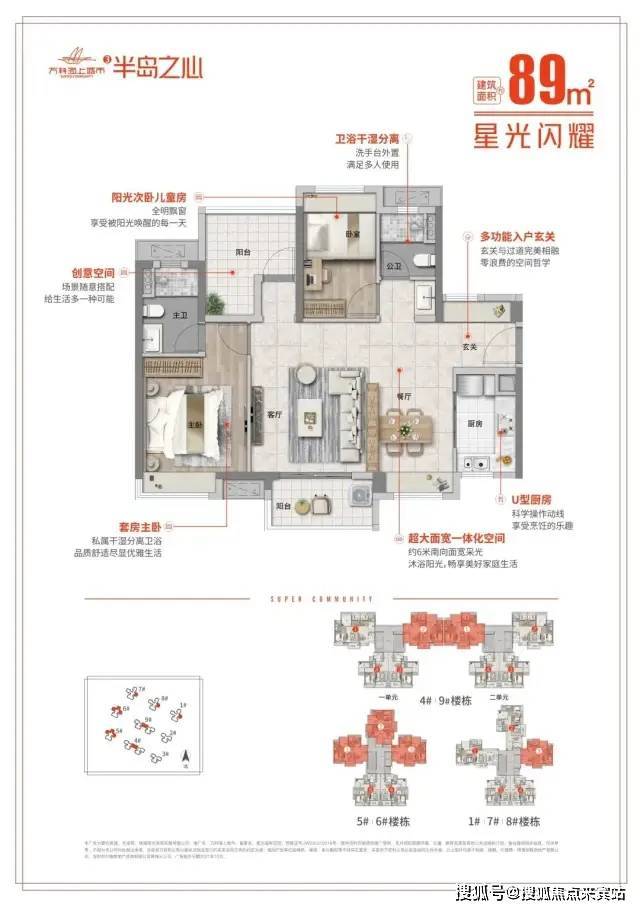 其中3、4栋为16层高的两梯四户超低密小高层;2、9栋为18层高的两梯四户低密小高层,1、5、6、7、8栋为27层高两梯五户的高层产品,整体设计取消了围合式的封闭感,打开南北视线通廊,丰富的天际线,高低错落有致,最大化避免楼栋之间的视线阻挡!