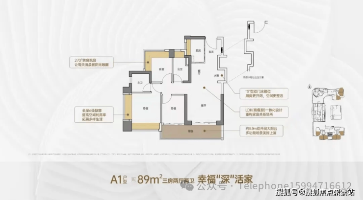 分布于1栋1/2/5单元,朝向多样,包括南向、东向和西向。竖厅格局,客厅3.5米开间,连接次卧出5.9米长大阳台。A1户型主卧双面飘窗,次卧270度转角飘窗;A2户型次卧270度转角飘窗,较A1少一面飘窗。U型厨房,卫生间干湿分离。