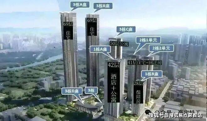 整个项目分两期开发建设,其中:项目一期东地块包含1栋酒店+商务公寓、1栋保障房、2栋包含一、二单元的住宅;西地块包含2栋高约250米的超高层住宅,另有1栋约50层高的商务公寓。