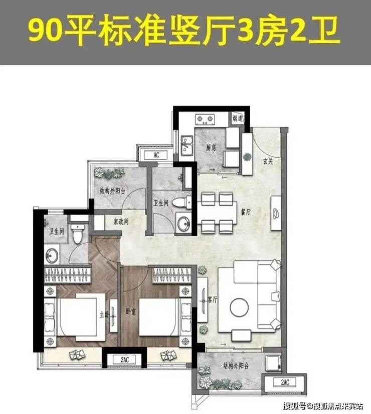 100平的竖厅户型,也是很普通了,就是90平的放大版,主卧更大了些。毫无特色或者卖点可言,但是也不能说户型设计不好, 就是这种感觉。