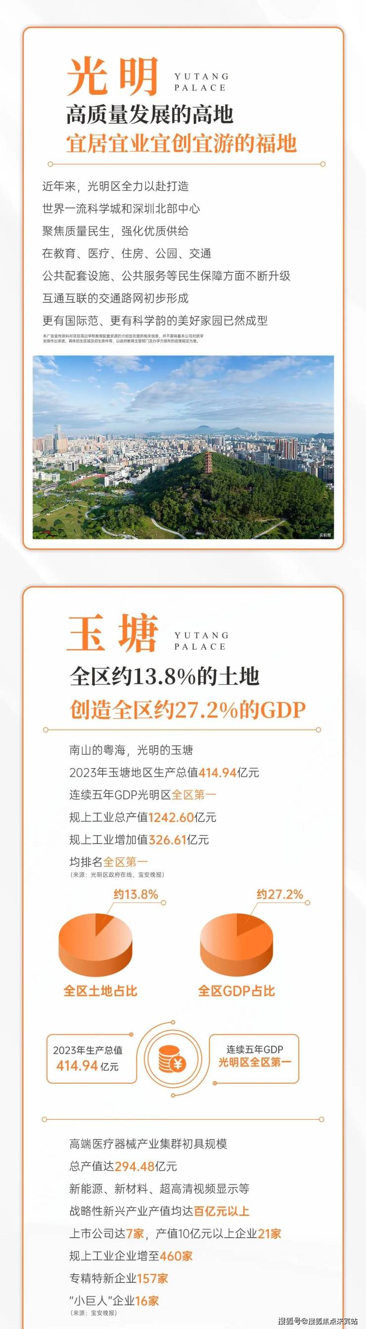 光明玉塘拥有“山、水、林、田、湖、温泉”等丰盛生态资源,提供生态休闲、温泉旅游、文旅度假、综合服务等优质服务功能,打造独具特色宜居宜业宜游的“光明南大门”。2024年玉塘GDP总量为449.3亿元,连续6年蝉联全区第一。腾飞之地,大有可为。