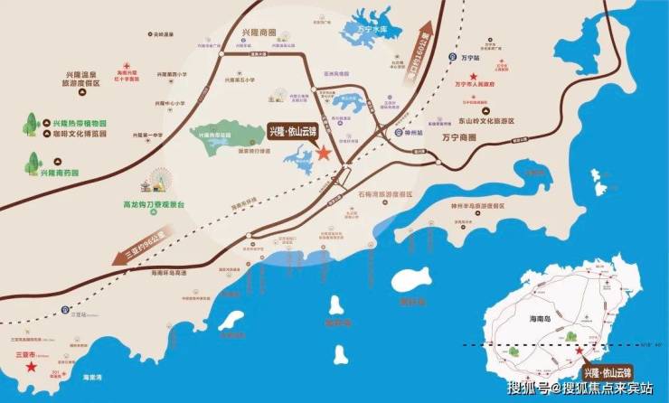 海南万宁 兴隆·依山云锦,十年匠心打磨,坐落于自然与人文和谐交融的兴隆华侨旅游经济区,拥抱山、海、湖、林、溪、岛6大自然稀缺资源:依山而居,享负氧离子浓度高达8万+的天然氧吧;近海而立,咫尺海南‘最美海湾’石梅湾。