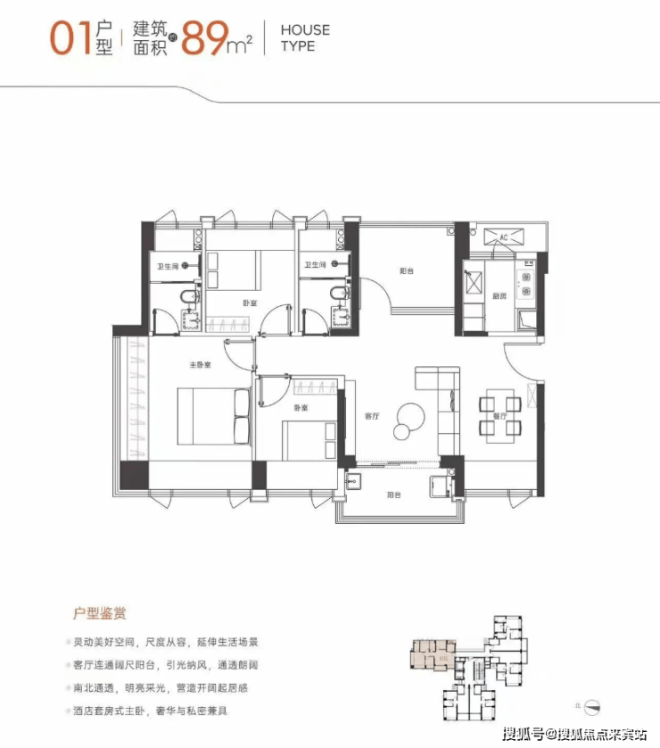 建面约 89㎡户型为横厅设计,南北双阳台,整体空间开阔明亮。