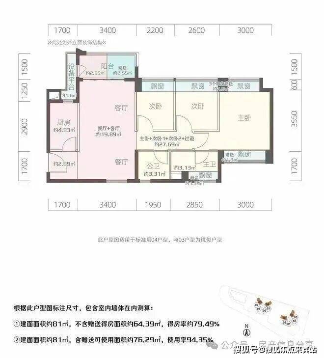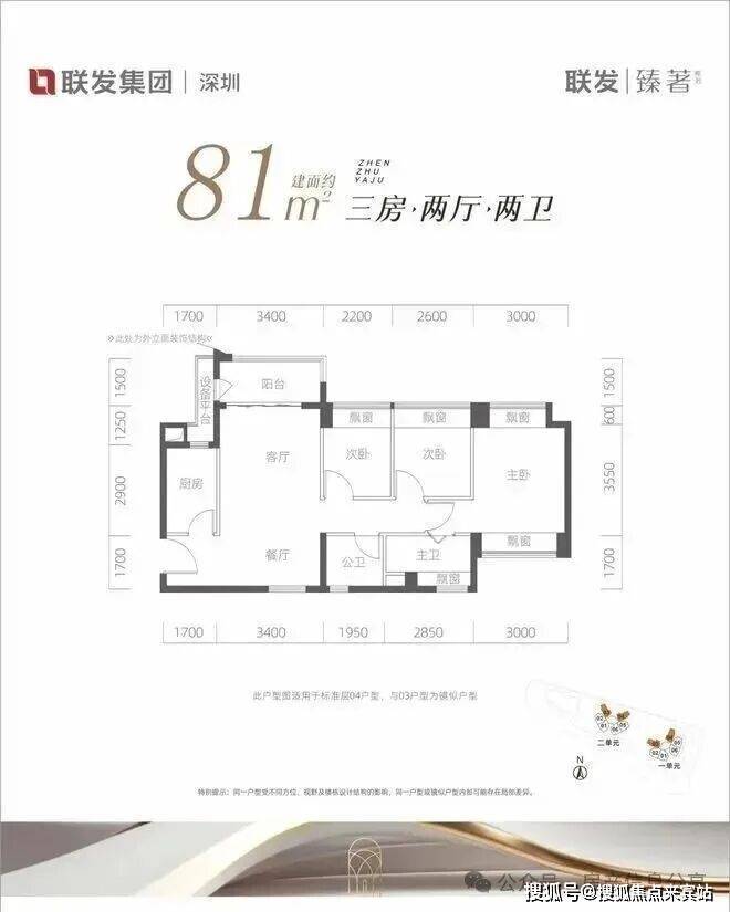 81㎡的3房2厅2卫,设计的是竖厅南北通透格局,客厅3.4米开间,3个卧室分别是3米/2.6米/2.2米的宽度,L型厨房,得房率:94.35%(包含赠送),阳台西北或东北朝向。联发臻著雅居售楼处电话✅:400-982-8802