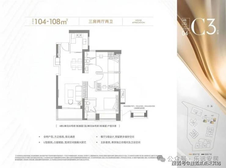 【建筑面积104-108㎡4房2卫】竖厅格局,进门入户玄关,客厅3.6米开间,LDKB一体化设计,进深8.7米,S墙设计预留冰箱卡槽位,三开间朝南,主卧套房设计,、得房率约72.45%(不含赠送),正南或正东朝向。