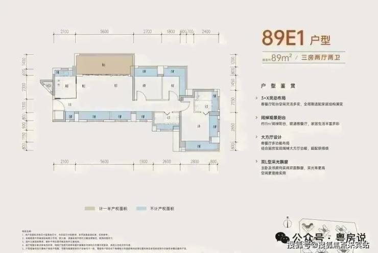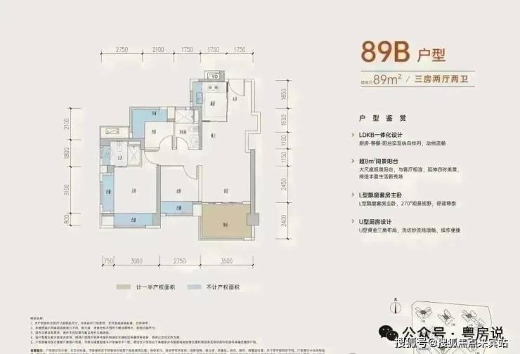 89㎡的3房2厅2卫,B户型,设计的是经典竖厅格局,进门入户玄关,客厅3.5米开间,三开间朝南,,主卧+1个次卧270°飘窗,3个卧室分别做到了主卧15.1㎡/次卧8.52㎡/次卧7.77㎡(包含墙体飘窗),得房率约:77.39%(不含赠送),西南朝向。赠送面积16.96㎡,加上赠送得房率96.84%。