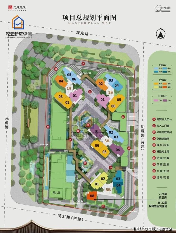 中建观玥占地约1.43万㎡,总建面约11.5万㎡,共由4栋总高32-33F住宅组成,其中1/2/3栋商品房33F,5栋商品房+保障房32F,4栋是1所6班制幼儿园。总规划820户,其中商品房719套,保障房101套(公租房+企业自持租赁住房),规划停车位约900个,容积率5.4。