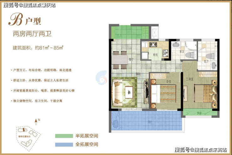 2# 楼在售户型:B 户型 85.36㎡两房两厅两卫;A 型 87.71㎡三房两厅。