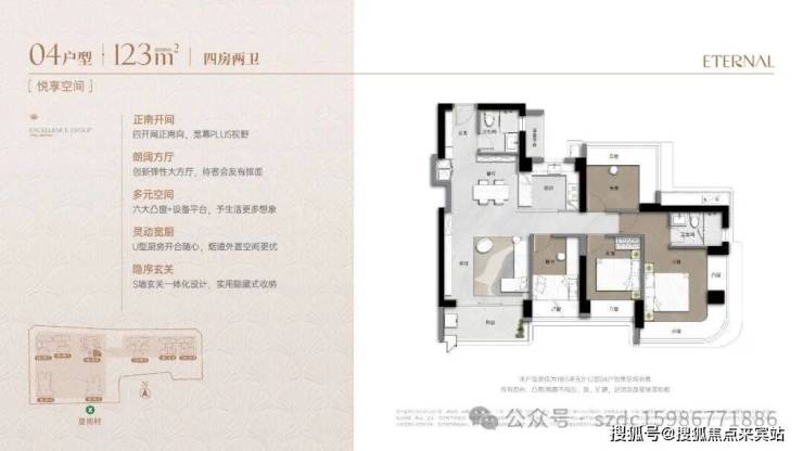 可售住宅部分即为卓越缦悦,一期主力户型为建面约91-173㎡3-4房,约232户,其中以122-173㎡的4房为主,纯粹改善型住区,采用了新规设计,户型平均使用率达到90%以上。