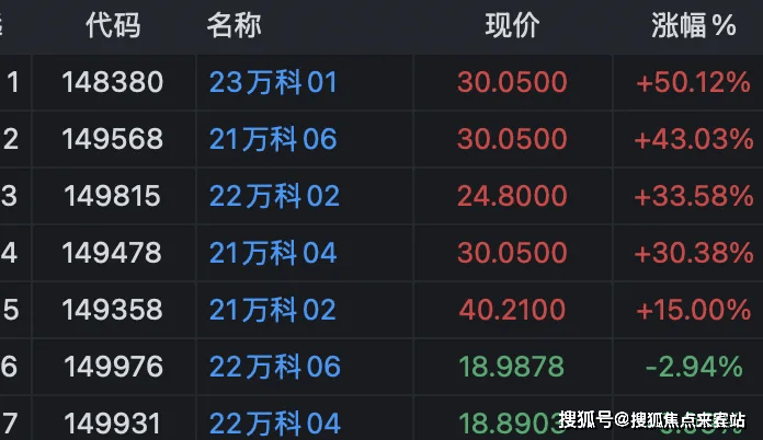 盘面上,万科多只境内债券飙涨一度触发交易所临时停牌,也引发不少关注。其中,“23万科01”涨超50%,“21万科06”涨逾40%、“22万科02”、“21万科04”涨超30%,“21万科02”涨约15%。